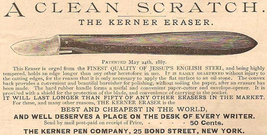 Kerner Eraser, The Kerner Pen Co., NY, NY, patented 1887, 1887 ad.