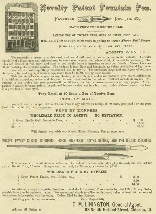 1864, Henry Owen, New York, NY, advertised Gillott's steel pens.